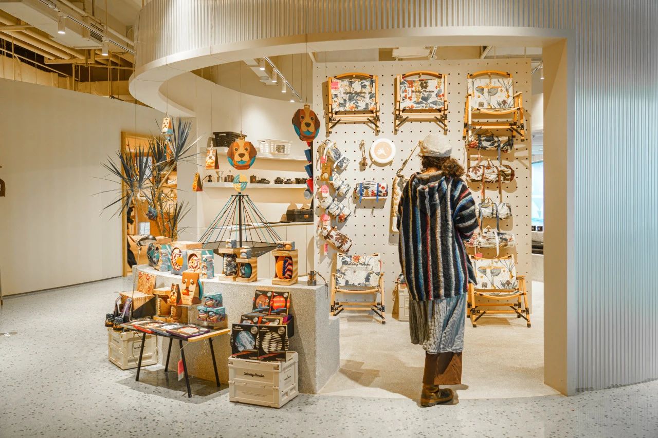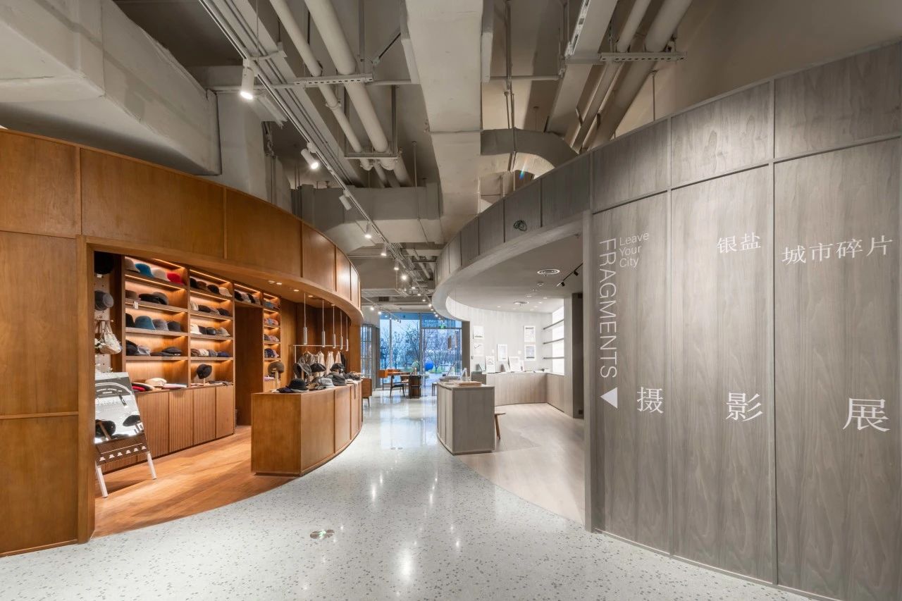 繞過裝置,進(jìn)入“大屋頂SPACE&銀鹽”集合空間,單向空間佇立于入口處左邊的區(qū)域,大量經(jīng)典的人文社科類書籍陳列在木質(zhì)結(jié)構(gòu)的弧形空間中;與之相對(duì)而立的是一大塊戶外&生活區(qū)域,由鋁板、筋石板、水磨石等材料構(gòu)建而成,自行車、服飾和廚具等戶外用品充斥其間。