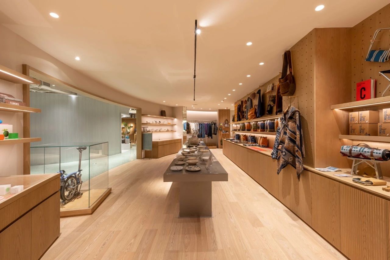 沿著曲折的動(dòng)線繼續(xù)向內(nèi)漫游,活動(dòng)、咖啡、服飾、展覽、家居等功能區(qū)次第出現(xiàn)在眼前,而空間中自然生長(zhǎng)的大量綠植讓人宛如置身室外,徜徉于一片綠洲之上。這些富于靈感的巧思,都來自設(shè)計(jì)師青山周平(下簡(jiǎn)稱“青山”)別出心裁的設(shè)計(jì)理念。